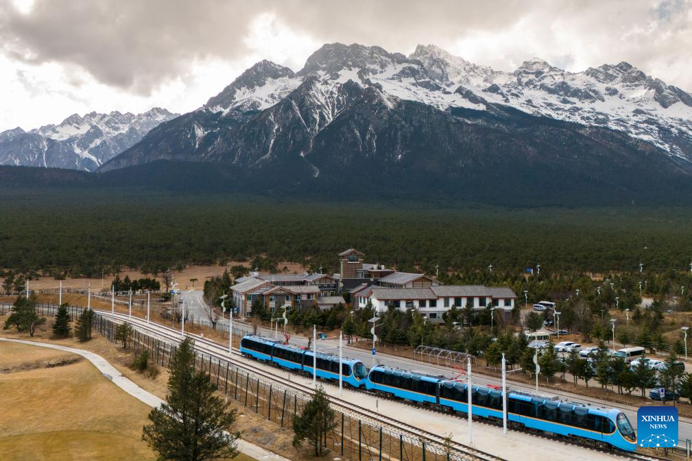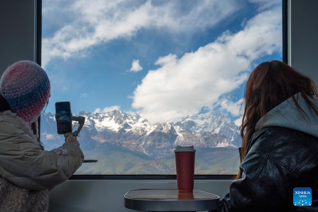 Tourists take a sightseeing train to enjoy the snow mountain scenery in southwest China's Yunnan Province, Feb. 25, 2025. A sightseeing train connecting Lijiang ancient town and Yulong Snow Mountain was launched here this February, becoming a new tourism hot spot in northwest Yunnan. (Photo by Peng Yikai/Xinhua)