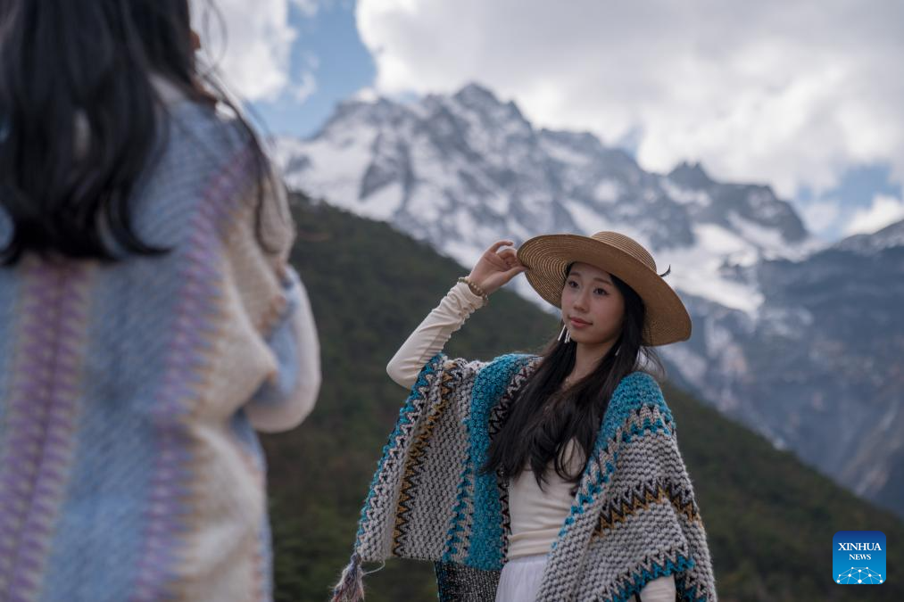A tourist poses for photos at Yulong Snow Mountain scenic area in southwest China's Yunnan Province, Feb. 25, 2025. A sightseeing train connecting Lijiang ancient town and Yulong Snow Mountain was launched here this February, becoming a new tourism hot spot in northwest Yunnan. (Photo by Peng Yikai/Xinhua)