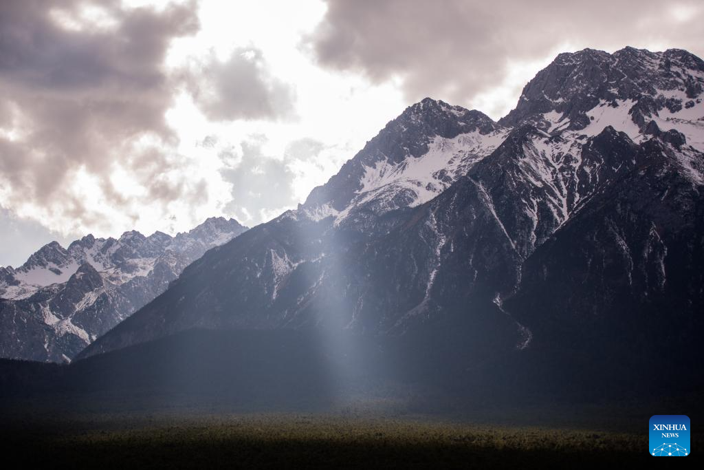 This photo taken on Feb. 25, 2025 shows the scenery of a snow mountain in southwest China's Yunnan Province. A sightseeing train connecting Lijiang ancient town and Yulong Snow Mountain was launched here this February, becoming a new tourism hot spot in northwest Yunnan. (Photo by Peng Yikai/Xinhua)