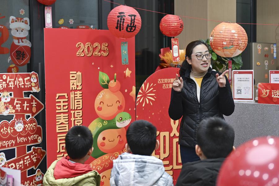 Sheng Hong (2nd R) interacts with a child during an event in celebration of the Lantern Festival at a residential community in Hongqiao Subdistrict of Changning District, east China's Shanghai, Feb. 15, 2025. (Xinhua/Chen Haoming)