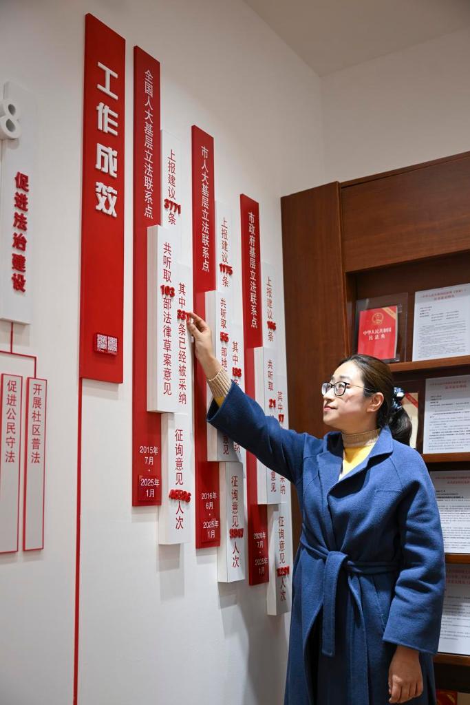 As a "post-80s" NPC deputy, Sheng Hong is both a witness and practitioner of whole-process people's democracy. Sheng has always been listening to the needs of residents and their opinions and suggestions on legislative work. At the Gubei civic center, where she hosts legislative hearings and discussions, a display board shows the number of legislative suggestions submitted and adopted. "Instead of renewing the whole display board, we now use magnet stickers to keep up with the fast-growing numbers," Sheng said.