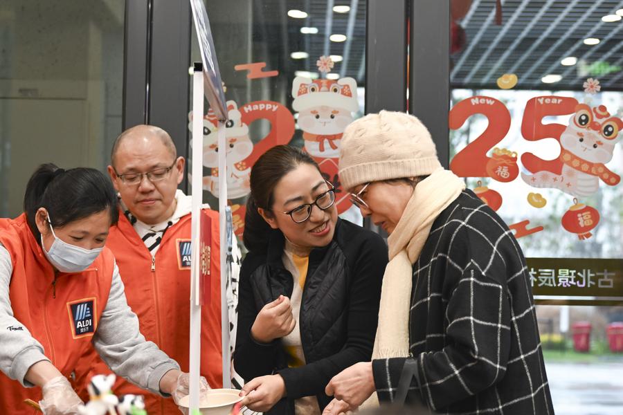 Sheng Hong (R) talks to the owner of a coffee shop at a residential community in Hongqiao Subdistrict of Changning District, east China's Shanghai, Feb. 24, 2025. (Xinhua/Liu Ying)