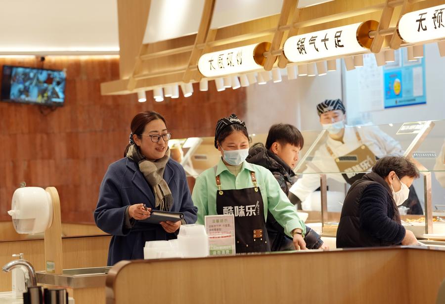 Sheng Hong (L) learns about the operation of a community canteen at a residential community in Hongqiao Subdistrict of Changning District, east China's Shanghai, Feb. 24, 2025. (Xinhua/Liu Ying)