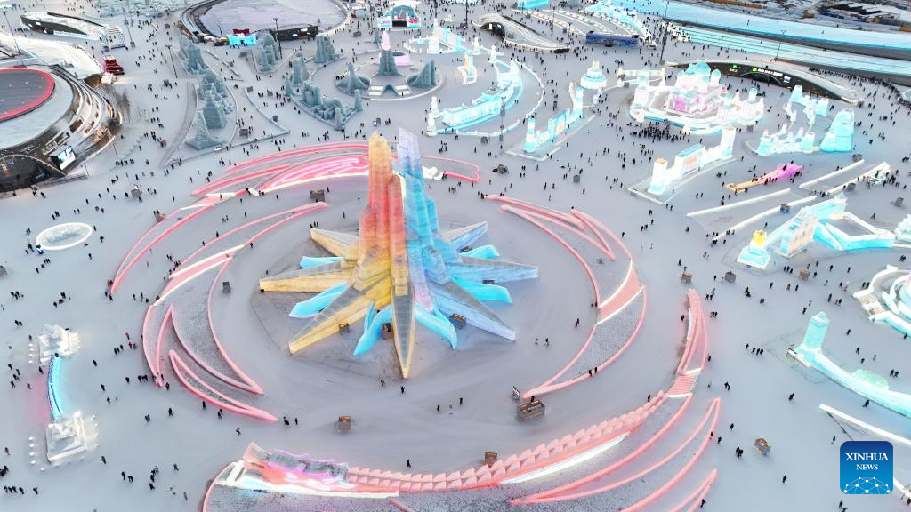 An aerial drone photo shows tourists watching performances at the Harbin Ice-Snow World in Harbin, northeast China's Heilongjiang Province, Feb. 26, 2025. Harbin Ice-Snow World, the world's largest ice-and-snow theme park, officially closed its 26th edition on Wednesday evening in the city of Harbin, capital of China's northernmost Heilongjiang Province, attracting a record-breaking 3.56 million tourist visits, said the park's operator. (Xinhua/Zhang Tao)