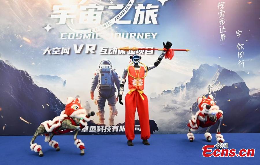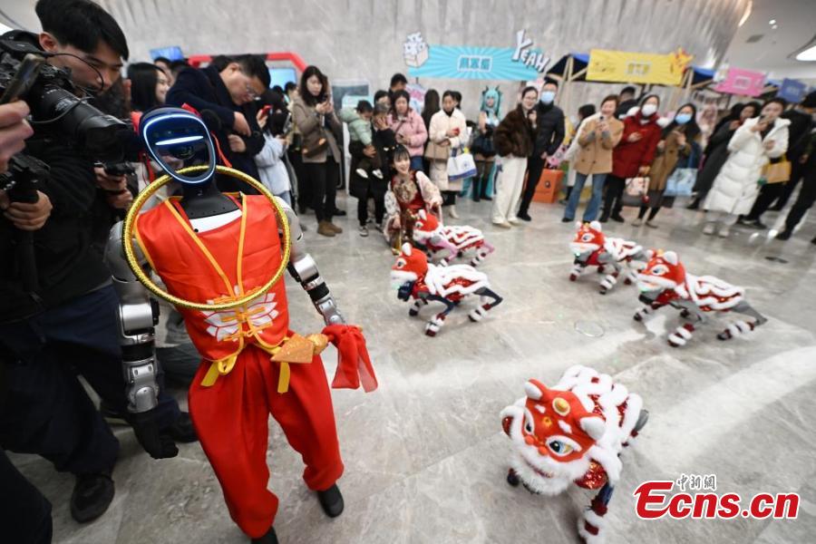 A humanoid robot and robot dogs perform during an event, attracting crowds in Hangzhou, east China's Zhejiang Province, Feb. 26, 2025. (China News Service/Wang Gang)