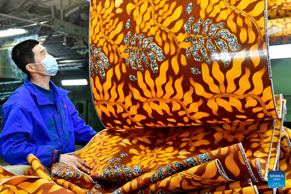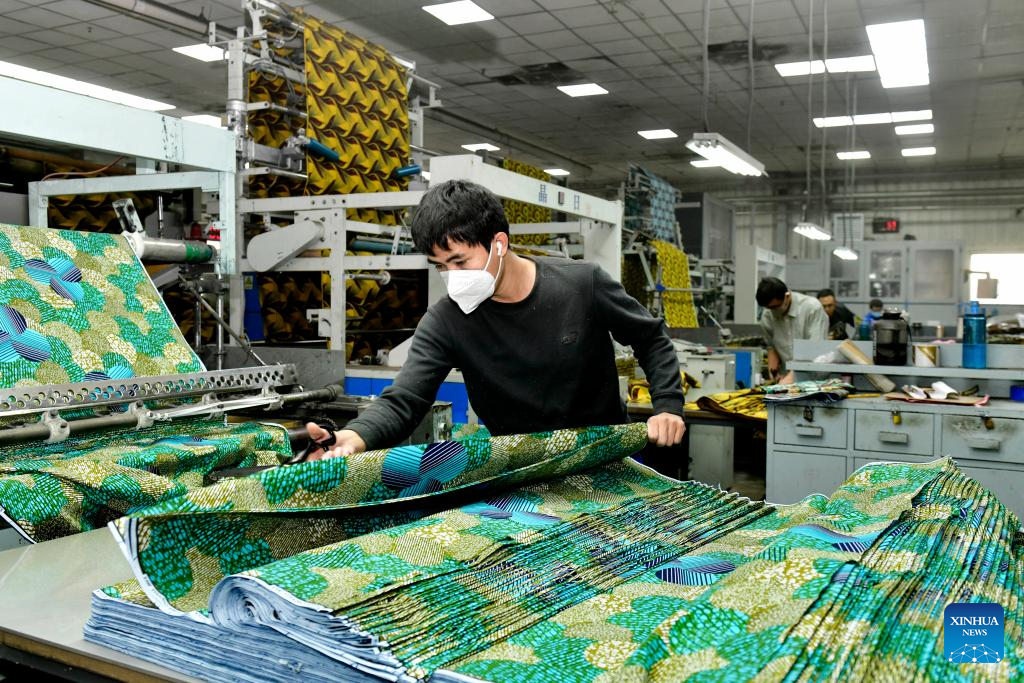 A worker processes fabric for export to Africa at a workshop in Binzhou, east China's Shandong Province, Feb. 25, 2025. Binzhou City is a major hub for private enterprises. In recent years, the city has fostered the development of private economy through comprehensive and end-to-end services. (Xinhua/Guo Xulei)