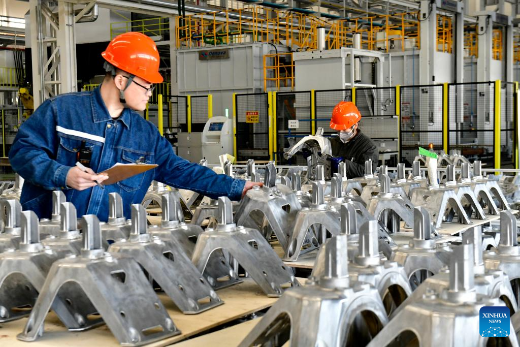 Workers check aluminum alloy components at a company in Binzhou, east China's Shandong Province, Feb. 26, 2025. Binzhou City is a major hub for private enterprises. In recent years, the city has fostered the development of private economy through comprehensive and end-to-end services. (Xinhua/Guo Xulei)