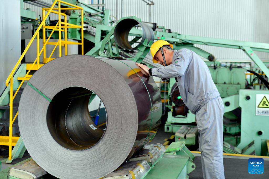 A worker checks color-coated steel plates at the workshop of Shandong Xinmeida Technology Materials Co. Ltd. in Binzhou, east China's Shandong Province, Feb. 26, 2025. Binzhou City is a major hub for private enterprises. In recent years, the city has fostered the development of private economy through comprehensive and end-to-end services. (Xinhua/Guo Xulei)