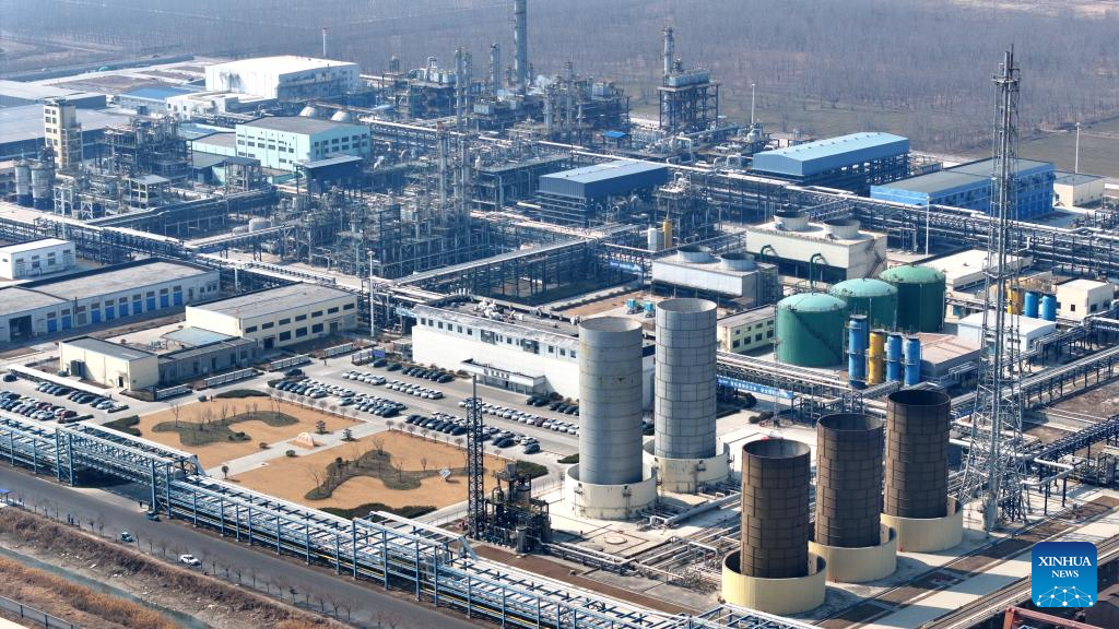 A drone photo taken on Feb. 26, 2025 shows the factory area of Shandong Jingbo Zhongju New Materials Co., Ltd. in Binzhou, east China's Shandong Province. Binzhou City is a major hub for private enterprises. In recent years, the city has fostered the development of private economy through comprehensive and end-to-end services. (Xinhua/Guo Xulei)