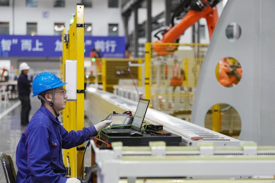 A staff member operates with smart equipment at a coil factory in Harbin Electric Machinery Company Ltd. in Harbin, northeast China's Heilongjiang Province, Feb. 26, 2025. (Xinhua/Wang Song)