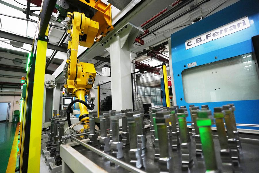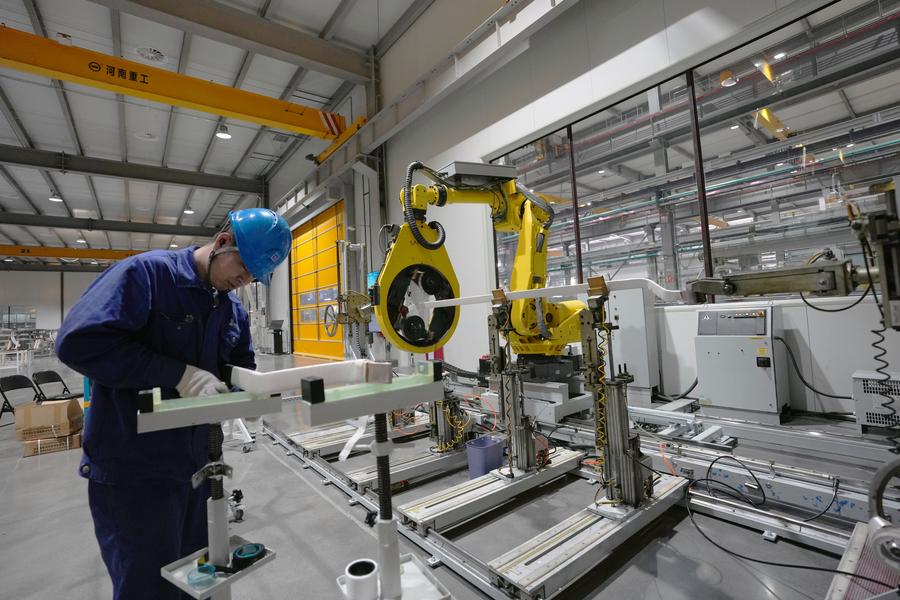 A robotic arm operates at a smart production line of Harbin Turbine Company Ltd. in Harbin, northeast China's Heilongjiang Province, Feb. 26, 2025. (Xinhua/Wang Song)