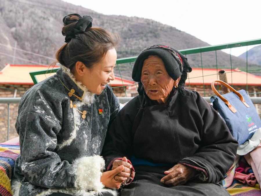 Gexi Wangmu (L) holds a senior villager's hand as they talk in Songgang Village of Maerkang City, Aba Tibetan-Qiang Autonomous Prefecture, southwest China's Sichuan Province, Feb. 18, 2025. (Xinhua/Wang Xi)