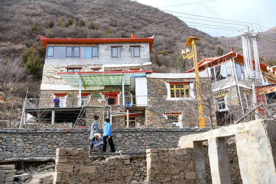 Gexi Wangmu (2nd R) and Zhao Chunxiu, Party secretary of Songgang Village, are seen on their way to a senior villager's home in Songgang Village of Maerkang City, Aba Tibetan-Qiang Autonomous Prefecture, southwest China's Sichuan Province, Feb. 18, 2025. (Xinhua/Wang Xi)