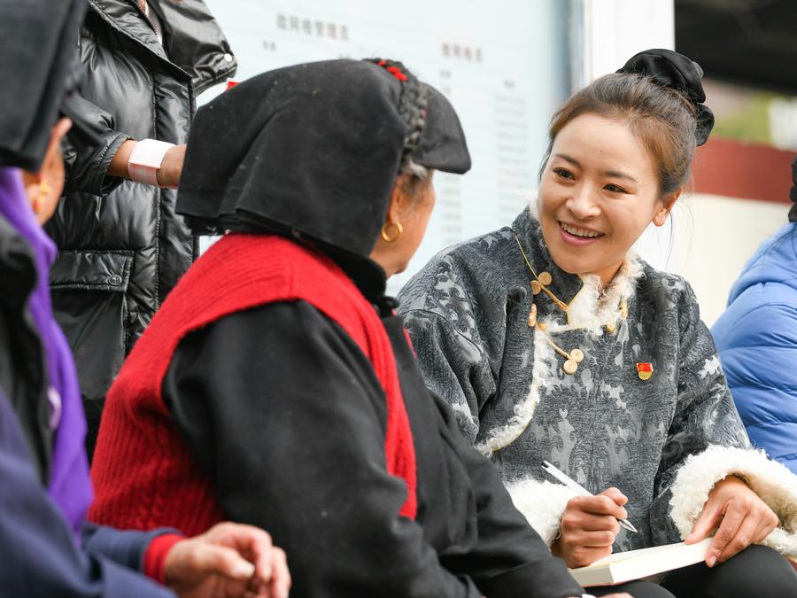 Gexi Wangmu (R) talks with seniors to learn about their daily living conditions in Songgang Village of Maerkang City, Aba Tibetan-Qiang Autonomous Prefecture, southwest China's Sichuan Province, Feb. 18, 2025. (Xinhua/Wang Xi)