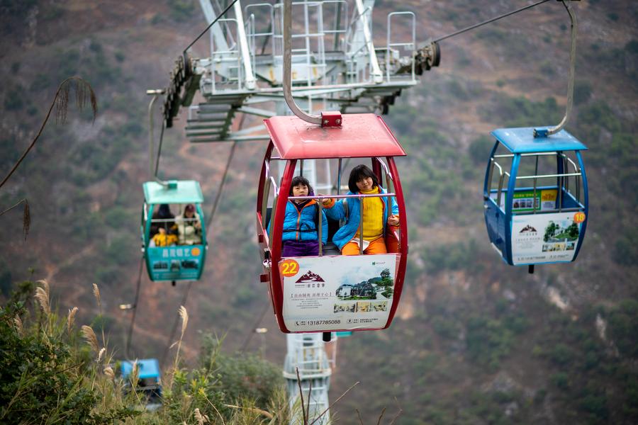 Students from Nizhuhe Village take a cable car on their way to school in Puli Township, Xuanwei City, southwest China's Yunnan Province, Feb. 23, 2025. (Xinhua/Jiang Wenyao)
