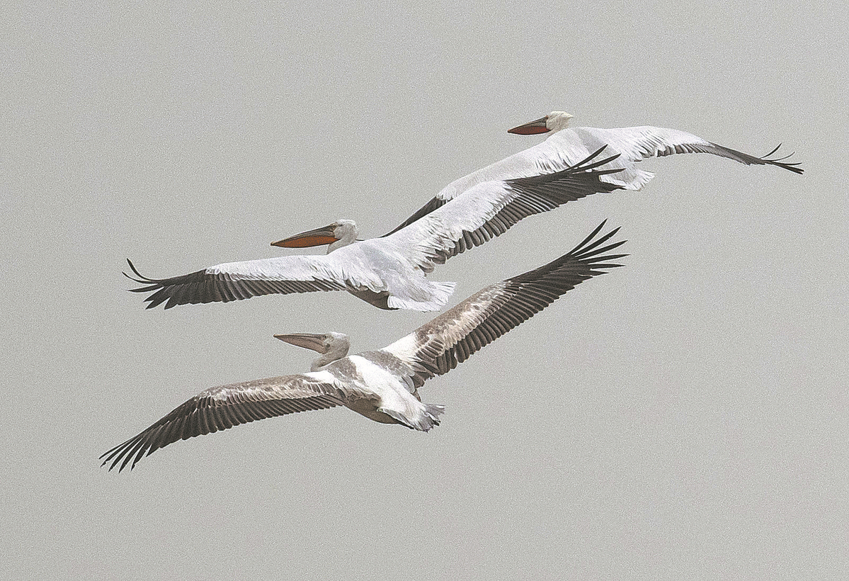 Three Dalmatian pelicans at the Jiuduansha Wetland Nature Reserve on Feb 14. [Photo by Chen Tengyi/For China Daily]