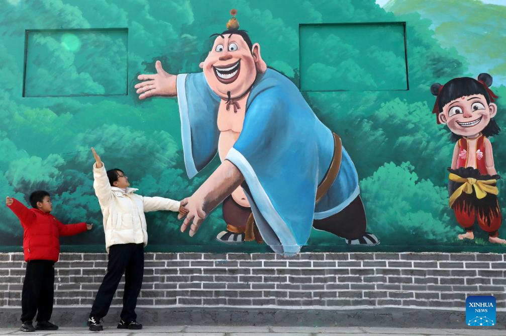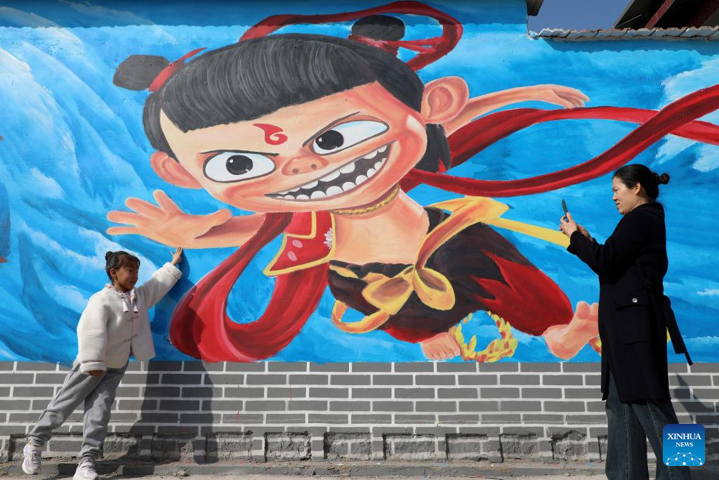 Tourists pose for photos with a wall painting featuring the hit animated film "Ne Zha 2" in Dongfeng Village of Boxing County in Binzhou, east China's Shandong Province, March 1, 2025. (Photo by Chen Bin/Xinhua)