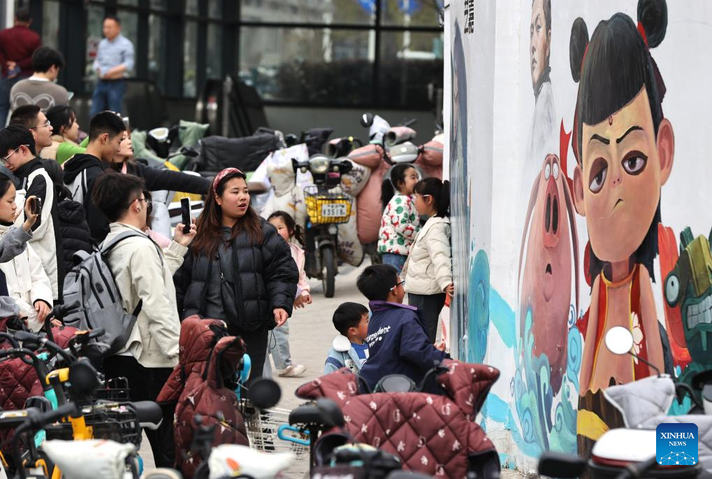 People take photos of a wall painting featuring the hit animated film "Ne Zha 2" in Jiangxia District of Wuhan, central China's Hubei Province, March 1, 2025. (Photo by Zhou Guoqiang/Xinhua)
