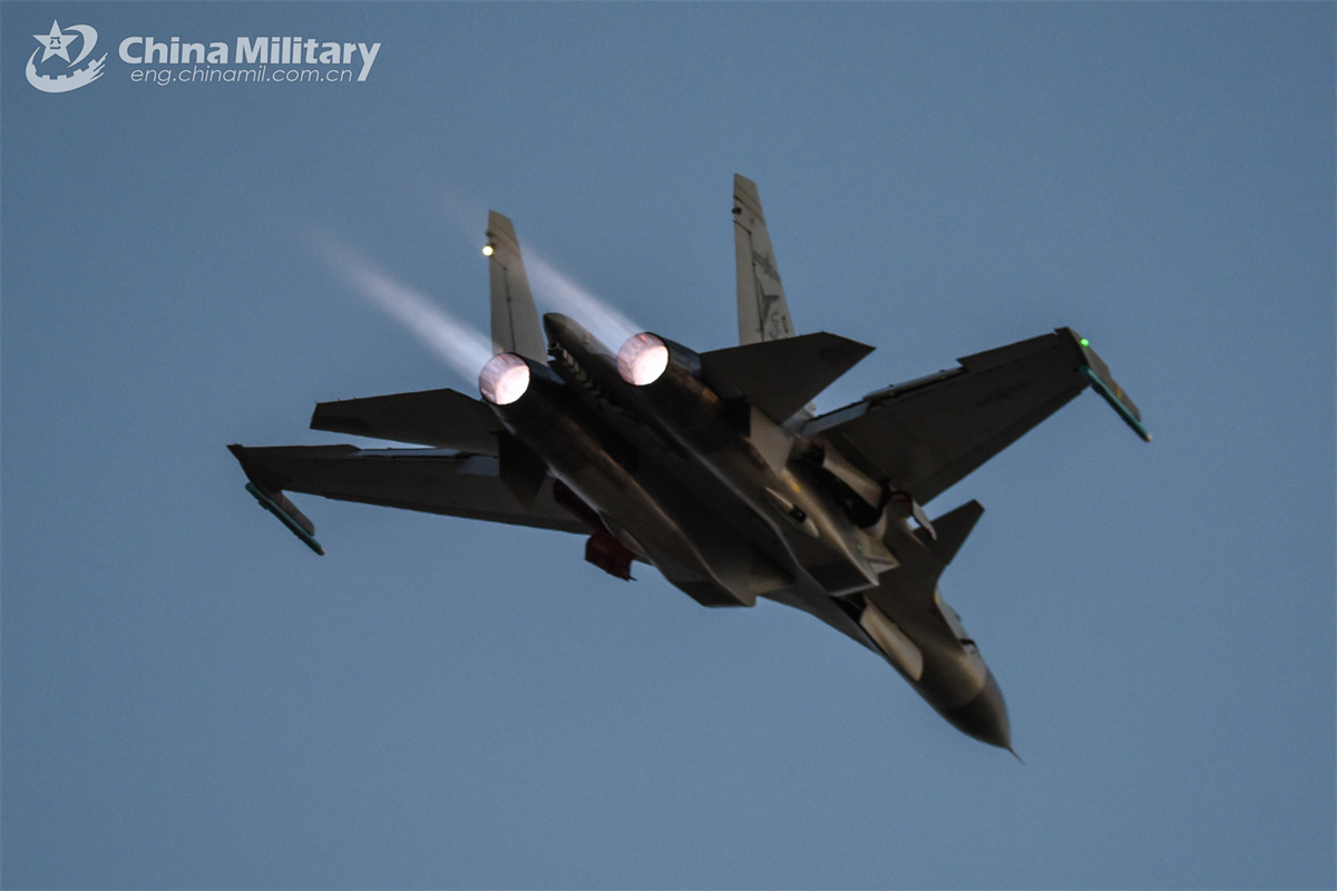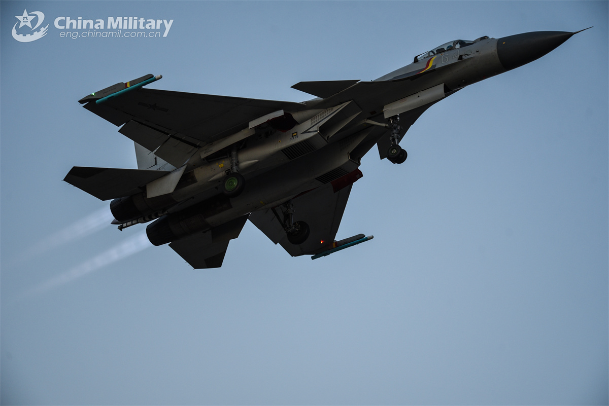 A J-15 carrier-based fighter jet attached to a regiment under the Chinese PLA Naval Aviation University soars into the sky during an eight-hour day-and-night flight training exercise in northeast China's Liaoning Province on February 20, 2025. (eng.chinamil.com.cn/Photo by Xu Yinglong)