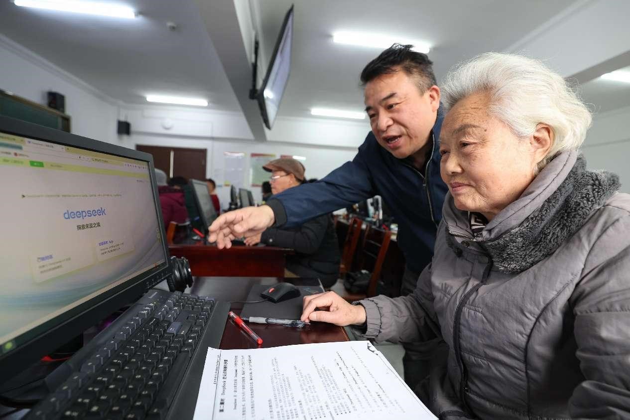 A teacher of a university for the aged instructs a senior to use DeepSeek in Xiangyang, central China's Hubei province, Feb. 24, 2025. (People's Daily Online/Yang Dong)