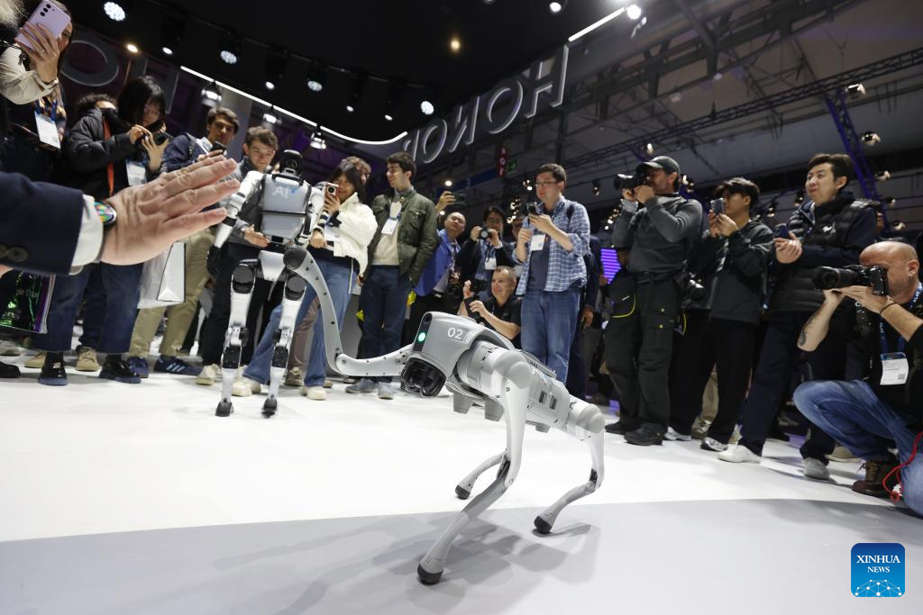 People watch a robotic dog during the 2025 Mobile World Congress in Barcelona, Spain, on March 3, 2025. The 2025 Mobile World Congress (MWC) opened here on Monday, bringing together industry leaders, policymakers, and technology innovators to explore advancements in 5G, artificial intelligence (AI), and advanced connectivity. (Xinhua/Zhao Dingzhe)
