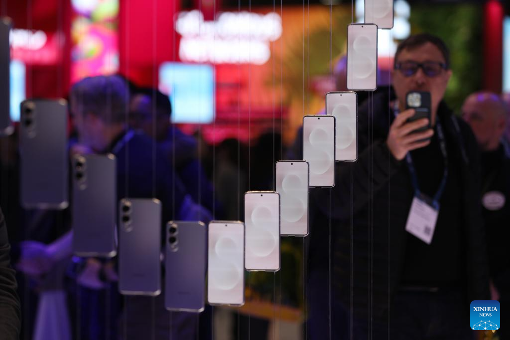 A man takes photos of smartphones during the 2025 Mobile World Congress in Barcelona, Spain, on March 3, 2025. The 2025 Mobile World Congress (MWC) opened here on Monday, bringing together industry leaders, policymakers, and technology innovators to explore advancements in 5G, artificial intelligence (AI), and advanced connectivity. (Xinhua/Zhao Dingzhe)