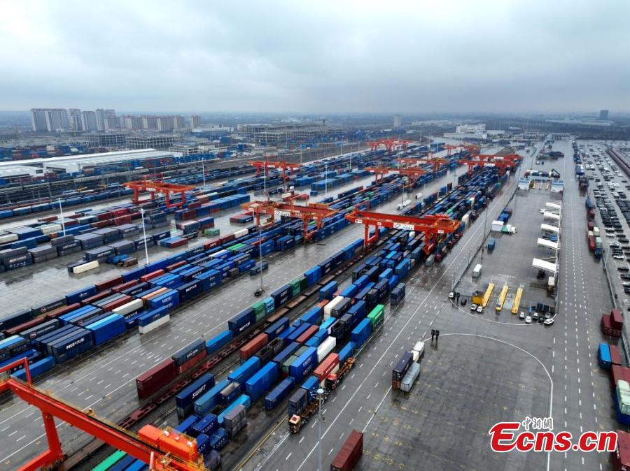 Freight train X8154, which is bound for Duisburg in Germany, waits to leave Xi'an International Port in northwest China's Shaanxi Province, Mar. 3, 2025. (China News Service/Zhang Yuan)