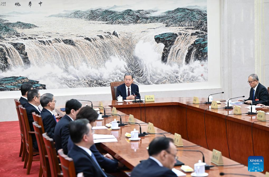 Zhao Leji, chairman of the National People's Congress (NPC) Standing Committee, presides over a preparatory meeting for the third session of the 14th NPC at the Great Hall of the People in Beijing, capital of China, March 4, 2025. (Xinhua/Huang Jingwen)
