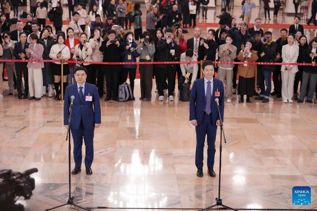 Deputies to the 14th National People's Congress (NPC) attend a group interview ahead of the opening meeting of the third session of the 14th NPC at the Great Hall of the People in Beijing, capital of China, March 5, 2025. (Xinhua/Zheng Huansong)