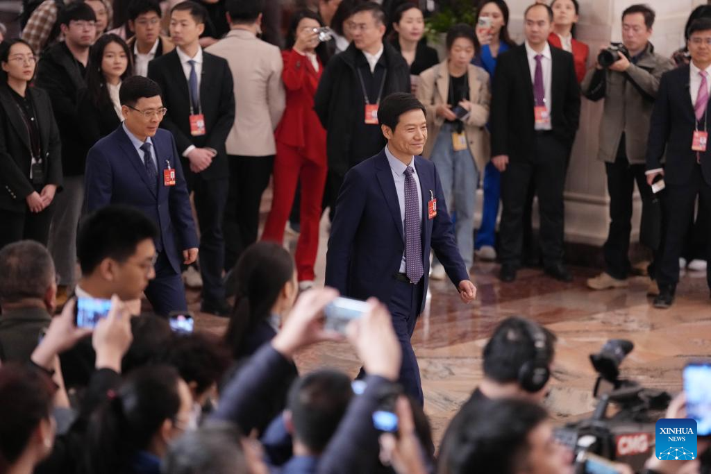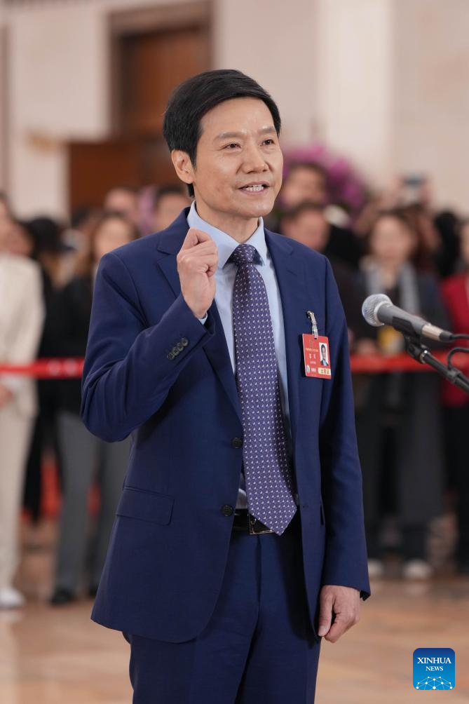 Lei Jun, a deputy to the 14th National People's Congress (NPC), attends a group interview ahead of the opening meeting of the third session of the 14th NPC at the Great Hall of the People in Beijing, capital of China, March 5, 2025. (Xinhua/Liu Dawei)