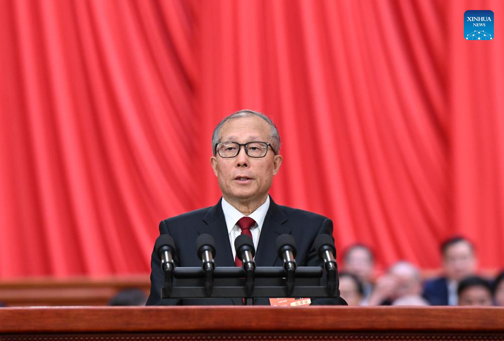 Li Hongzhong, vice chairman of the National People's Congress (NPC) Standing Committee, explains a draft amendment to the Law on Deputies to the National People's Congress and to the Local People's Congresses at Various Levels at the opening meeting of the third session of the 14th NPC at the Great Hall of the People in Beijing, capital of China, March 5, 2025. (Xinhua/Zhang Ling)