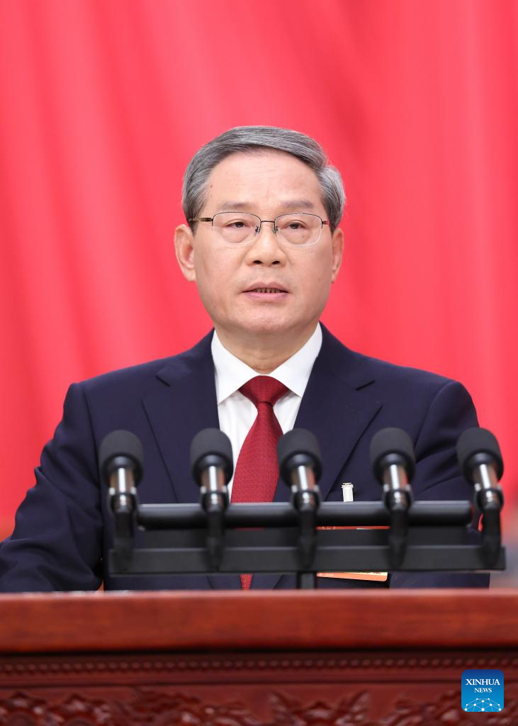 Chinese Premier Li Qiang delivers a government work report at the opening meeting of the third session of the 14th National People's Congress (NPC) at the Great Hall of the People in Beijing, capital of China, March 5, 2025. (Xinhua/Li Xueren)