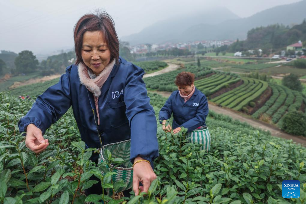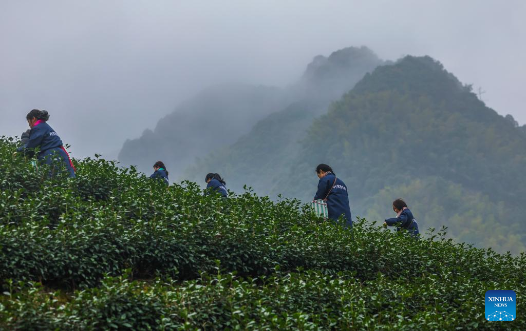 Farmers pick tea leaves at a tea garden in Wangzhai Town of Wuyi County, Jinhua City, east China's Zhejiang Province, March 5, 2025. As spring unfolds, tea gardens across Wuyi County have entered the harvest season. In recent years, Wuyi County has advanced the tea industry as its pillar industry. By the end of 2024, the total area of tea plantation in Wuyi County has reached 125,700 mu (approximately 8,380 hectares). More than 60,000 farmers have directly benefited from tea-related businesses. (Xinhua/Xu Yu)