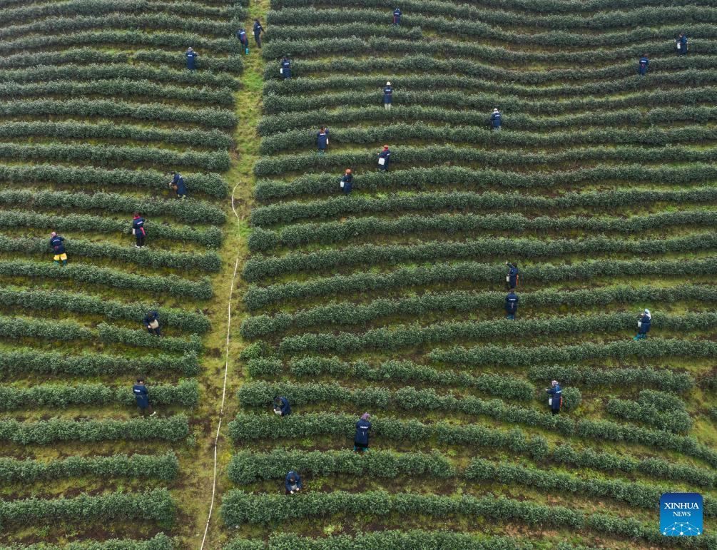 An aerial drone photo taken on March 5, 2025 shows farmers picking tea leaves at a tea garden in Wangzhai Town of Wuyi County, Jinhua City, east China's Zhejiang Province. As spring unfolds, tea gardens across Wuyi County have entered the harvest season. In recent years, Wuyi County has advanced the tea industry as its pillar industry. By the end of 2024, the total area of tea plantation in Wuyi County has reached 125,700 mu (approximately 8,380 hectares). More than 60,000 farmers have directly benefited from tea-related businesses. (Xinhua/Xu Yu)