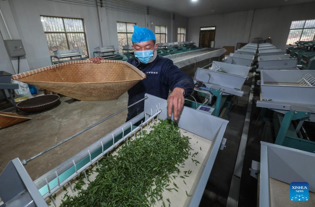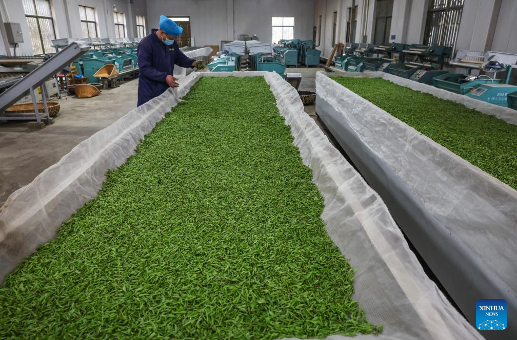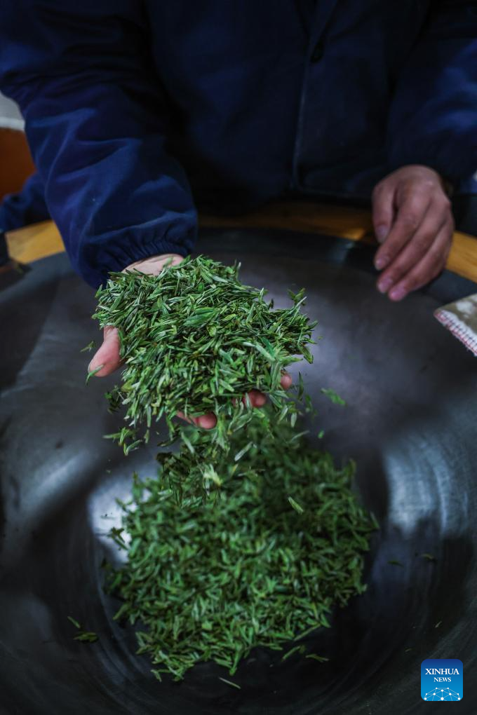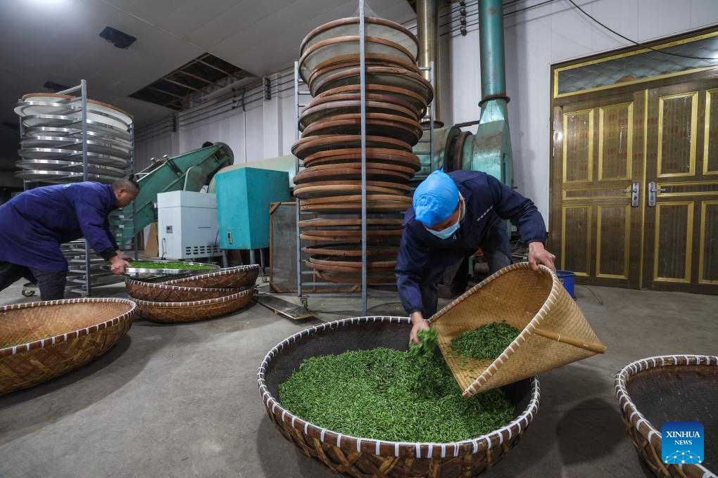A worker processes tea leaves at the workshop of a tea garden in Wangzhai Town of Wuyi County, Jinhua City, east China's Zhejiang Province, March 5, 2025. As spring unfolds, tea gardens across Wuyi County have entered the harvest season. In recent years, Wuyi County has advanced the tea industry as its pillar industry. By the end of 2024, the total area of tea plantation in Wuyi County has reached 125,700 mu (approximately 8,380 hectares). More than 60,000 farmers have directly benefited from tea-related businesses. (Xinhua/Xu Yu)