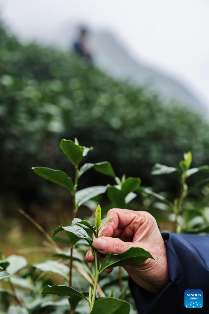 A farmer displays freshly-picked tea leaves at a tea garden in Wangzhai Town of Wuyi County, Jinhua City, east China's Zhejiang Province, March 5, 2025. As spring unfolds, tea gardens across Wuyi County have entered the harvest season. In recent years, Wuyi County has advanced the tea industry as its pillar industry. By the end of 2024, the total area of tea plantation in Wuyi County has reached 125,700 mu (approximately 8,380 hectares). More than 60,000 farmers have directly benefited from tea-related businesses. (Xinhua/Xu Yu)