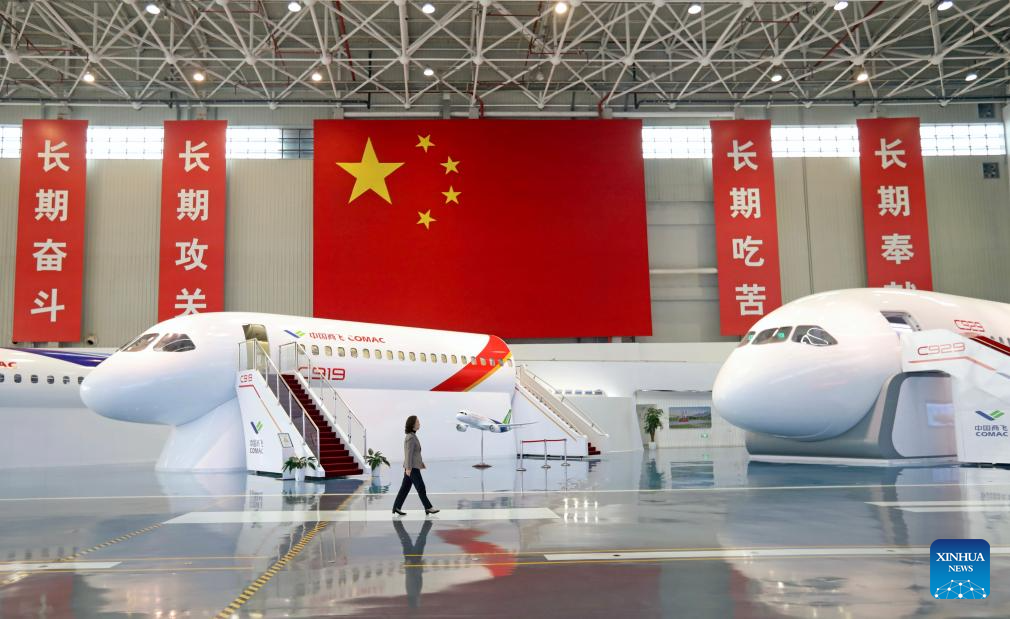 Zhao Chunling walk past the mockup of C919 and C929 aircraft at a research institute of Commercial Aircraft Corporation of China (COMAC) in Shanghai, east China, March 5, 2025. (Xinhua/Liu Ying)