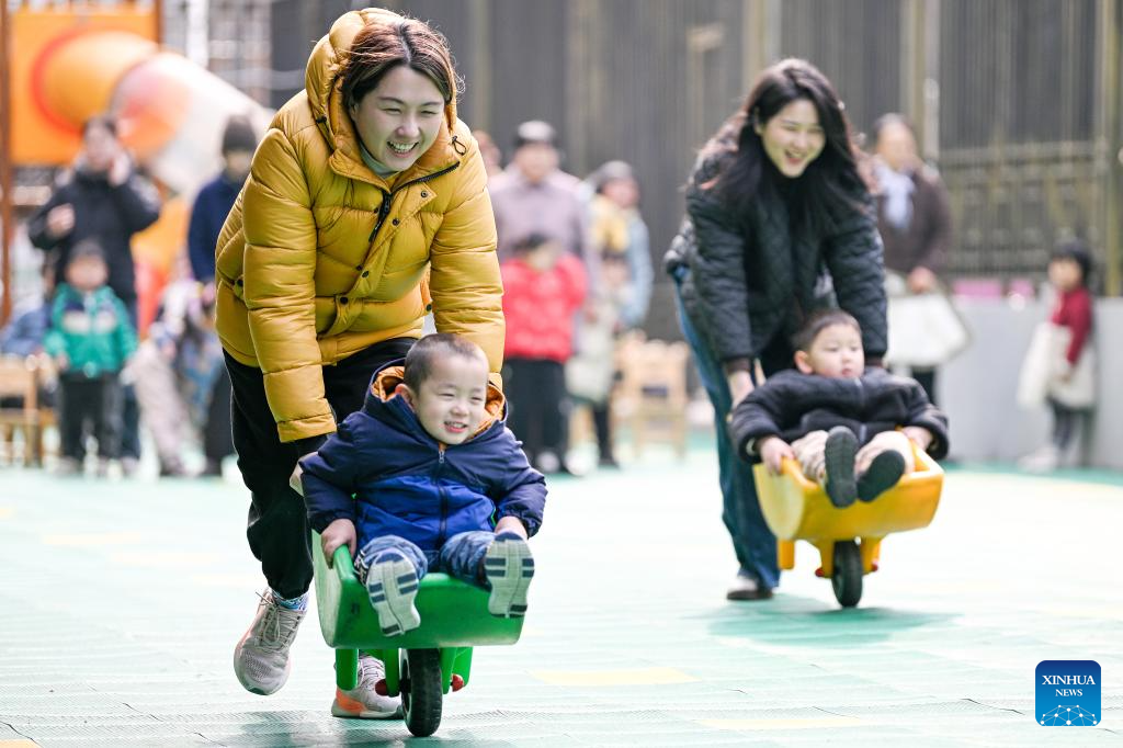 Women attend an event celebrating the International Women's Day with their children at a kindergarten in Nanjing, east China's Jiangsu Province, on March 7, 2025. Various activities are held across the country to mark the International Women's Day. (Photo by Fang Dongxu/Xinhua)