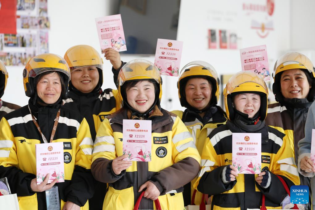 Deliverywomen display handbooks on women's rights in Linyi, east China's Shandong Province, on March 7, 2025. Various activities are held across the country to mark the International Women's Day. (Photo by Zhang Chunlei/Xinhua)