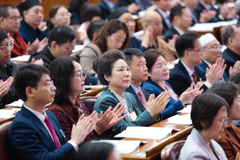 Cheng Hong, a member of the 14th National Committee of the Chinese People's Political Consultative Conference (CPPCC), speaks on behalf of the Central Committee of the China Democratic League at the third plenary meeting of the third session of the 14th CPPCC National Committee at the Great Hall of the People in Beijing, capital of China, March 9, 2025. (Xinhua/Rao Aimin)
