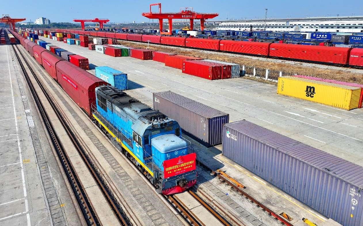 A China-Europe freight train carrying 290 new energy vehicles departs from Nanchang International Land Port, east China's Jiangxi province, Jan. 19, 2025. These vehicles will be sold to Kazakhstan, Uzbekistan and other countries. (People's Daily Online/Zhu Haipeng)