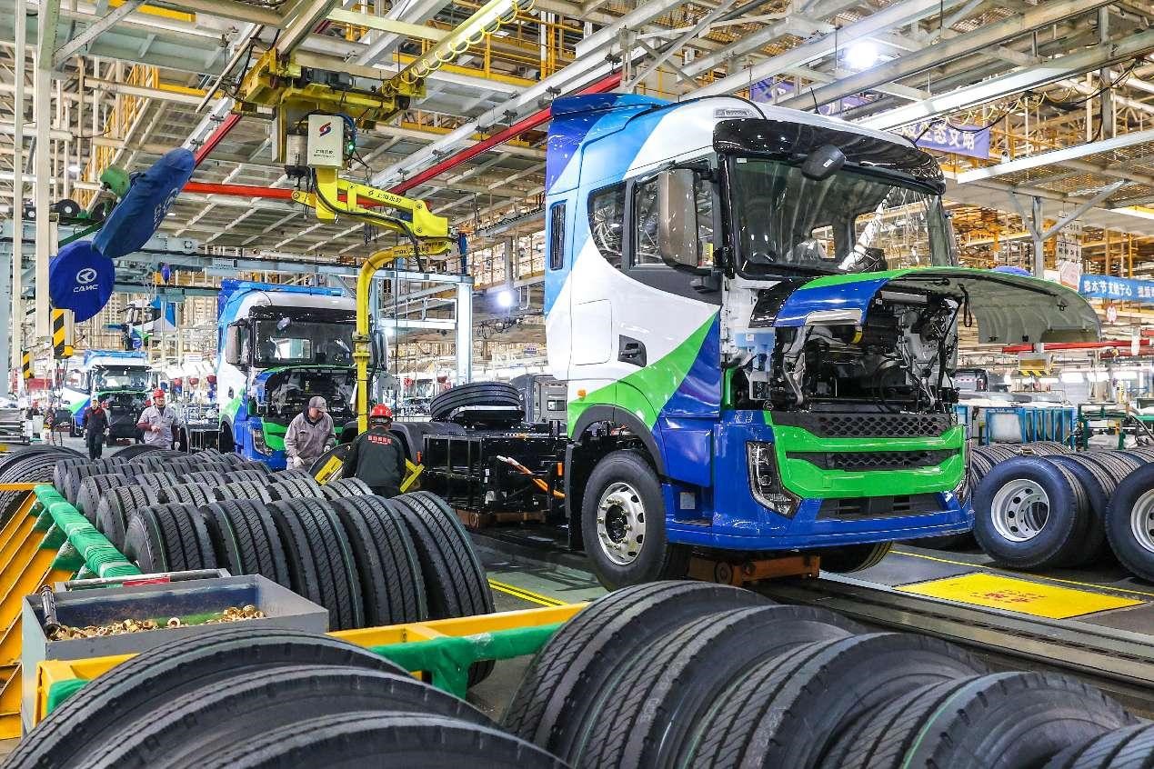 New energy trucks are assembled in a workshop of Chinese heavy-duty truck manufacturer CAMC in Ma'anshan, east China's Anhui province, Feb. 17, 2025. (People's Daily Online/Wang Wensheng)
