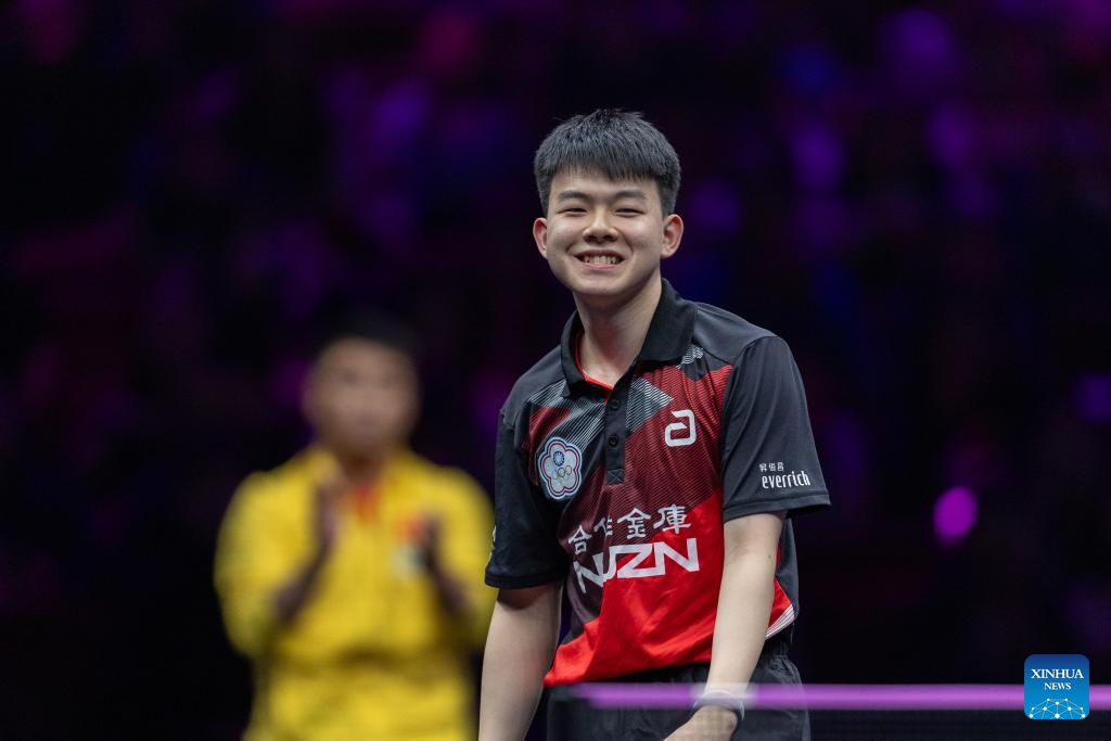 Kao Cheng-Jui of Chinese Taipei hits a return during the men's singles round of 32 match against Lin Shidong of China at the WTT Champions Chongqing 2025 in southwest China's Chongqing, March 11, 2025. (Xinhua/Huang Wei)