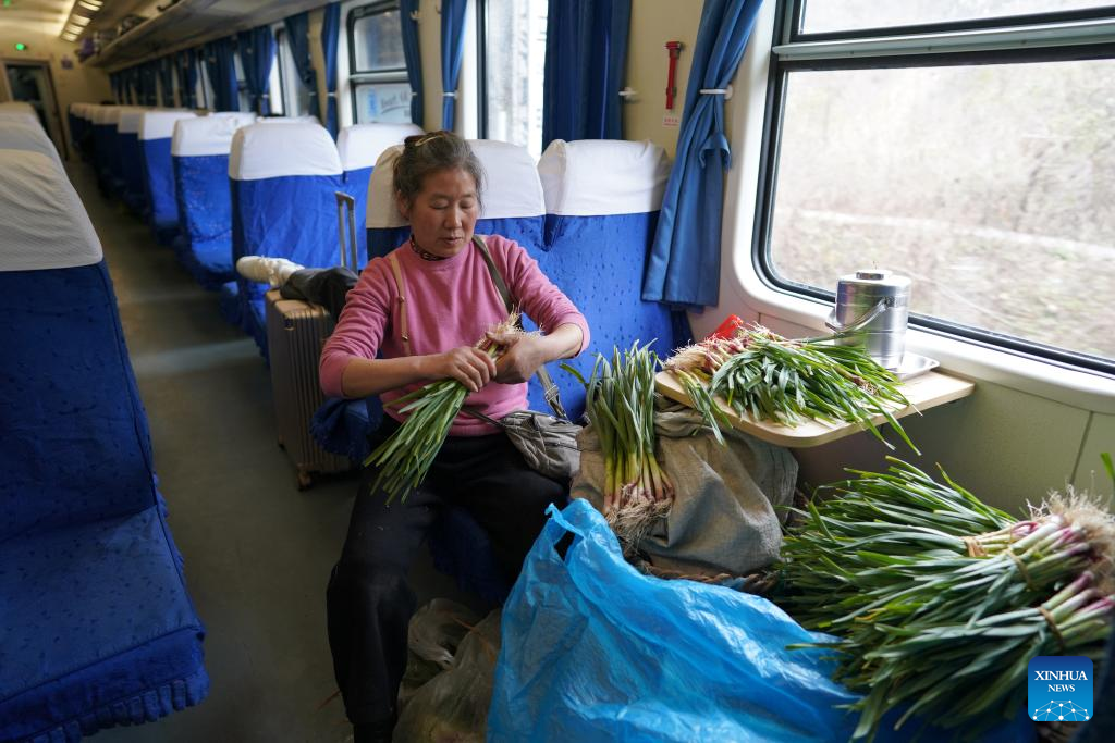 A woman arranges vegetable on the No. 6064 train running from Guangyuan in southwest China's Sichuan Province to Baoji in northwest China's Shaanxi Province, Feb. 17, 2025. (Xinhua/Shao Rui)