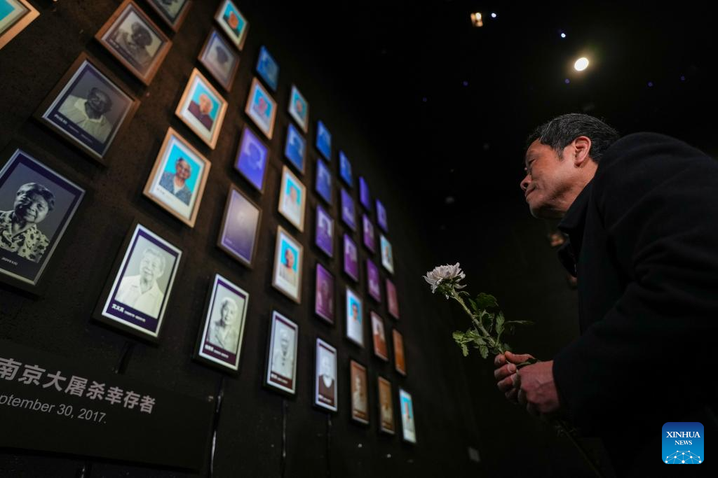 Huang Xinghua, son of Nanjing Massacre survivor Ai Yiying, lays a flower at a "lights out" mourning ceremony held at the Memorial Hall of the Victims in Nanjing Massacre by Japanese Invaders, in Nanjing, east China's Jiangsu Province, March 11, 2025. A "lights out" mourning ceremony for four survivors of the Nanjing Massacre who passed away this year was held Tuesday in Nanjing.
