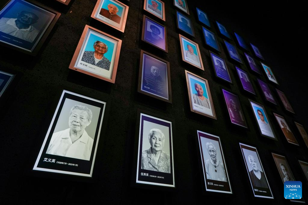Light boxes of Nanjing Massacre survivors Ai Yiying, Wu Xiuying, Yi Lanying and Tao Chengyi (L-R in the bottom row), who passed away this year, are seen on the photo wall at the Memorial Hall of the Victims in Nanjing Massacre by Japanese Invaders, in Nanjing, east China's Jiangsu Province, March 11, 2025. A "lights out" mourning ceremony for four survivors of the Nanjing Massacre who passed away this year was held Tuesday in Nanjing.