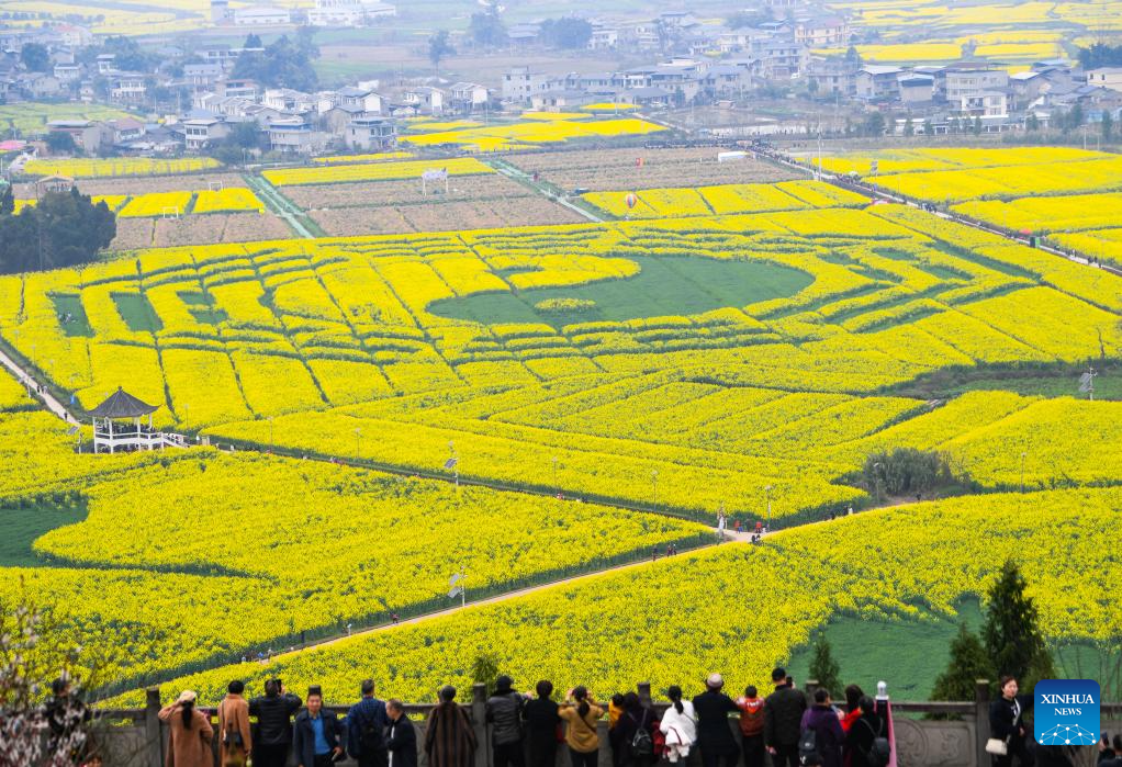 Tourists enjoy the scenery of rapeseed flowers at Chongkan scenic spot in Tongnan District, southwest China's Chongqing Municipality, March 12, 2025. As spring unfolds, rapeseed flowers here have entered the blooming season, attracting tourists to visit. (Xinhua/Wang Quanchao)