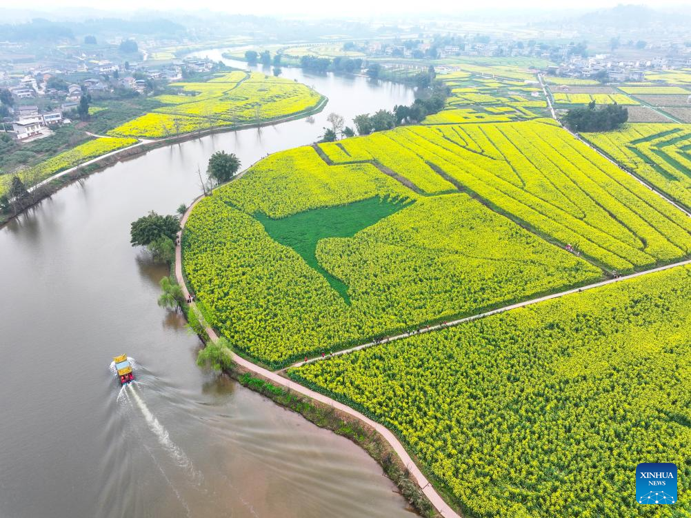 An aerial drone photo taken on March 12, 2025 shows a tourist boat sailing on the water at Chongkan scenic spot in Tongnan District, southwest China's Chongqing Municipality. As spring unfolds, rapeseed flowers here have entered the blooming season, attracting tourists to visit. (Xinhua/Wang Quanchao)
