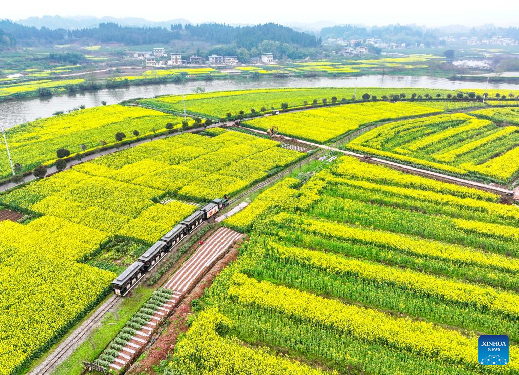 An aerial drone photo taken on March 12, 2025 shows a train running across Chongkan scenic spot in Tongnan District, southwest China's Chongqing Municipality. As spring unfolds, rapeseed flowers here have entered the blooming season, attracting tourists to visit. (Xinhua/Wang Quanchao)
