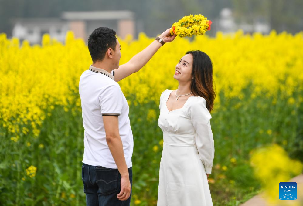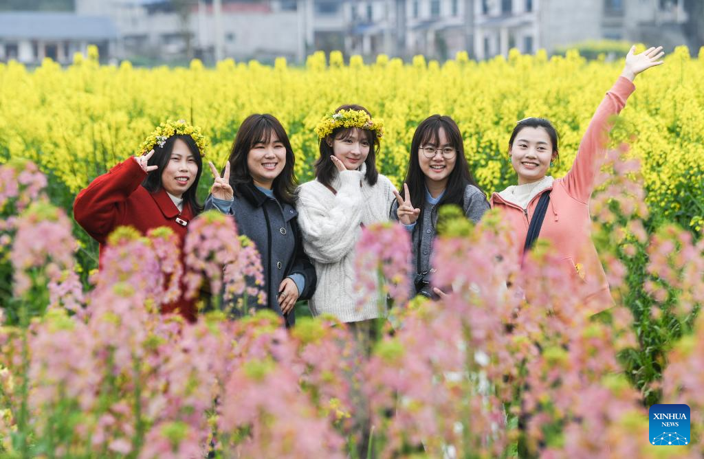 Tourists pose for photos at Chongkan scenic spot in Tongnan District, southwest China's Chongqing Municipality, March 12, 2025. As spring unfolds, rapeseed flowers here have entered the blooming season, attracting tourists to visit. (Xinhua/Wang Quanchao)